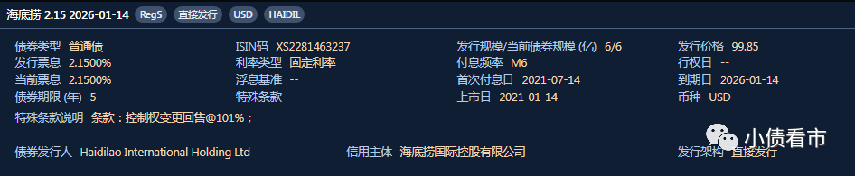 《小債看市》統計,目前海底撈僅存續上述一只美元債,存續規模6億美元,票息2.15%,將于2026年1月14日到期。