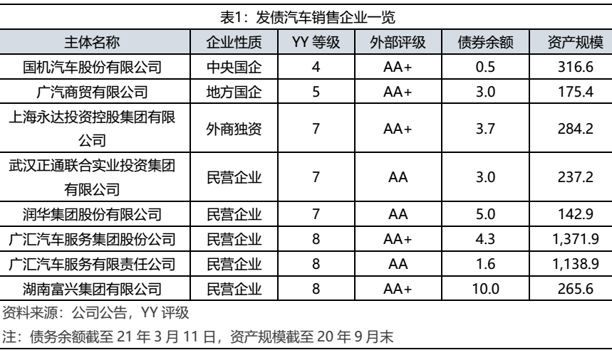 汽車銷售行業在債券市場中存在感較弱,當前發債的汽車銷售企業共8家,其中國機汽車為央企,廣汽商貿為國企,其他企業皆為民企。資質等級以低等級為主,國機汽車、廣汽商貿YY等級分別為4、5,永達集團、武漢正通、潤華集團YY評級為7。行業龍頭廣匯集團及其子公司皆發債,但規模不大,YY評級為8。發債規模最大的富興集團評級亦為8。