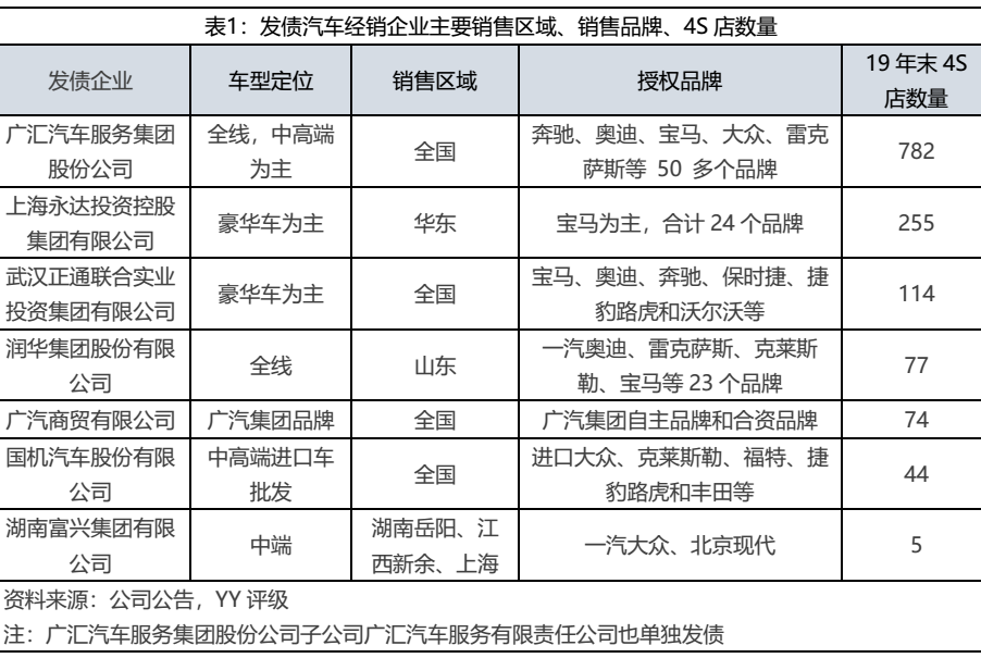 業務方面,國機汽車主營進口車批發貿易,零售規模較小。其他發債主體以4S店零售為主,其中廣汽物貿主要銷售廣汽自主和合資品牌,永達集團、武漢正通以寶馬、奧迪、奔馳等豪華車品牌銷售為主,富興集團僅有5家4S店,授權品牌僅一汽大眾、北京現代兩家,廣匯集團、潤華集團則品牌布局較全面。從銷售區域來看,潤華集團、永達集團為區域性經銷商,分別主要布局在山東、華東區域,其他經銷商(除僅5家店的富興集團)則布局分散。截至2019年末,第一大經銷商廣匯集團4S店數量達782家,上海永達、武漢正通4S店數量也超過100家,而國機汽車以批發為主、零售為輔,4S店數量相對較少。