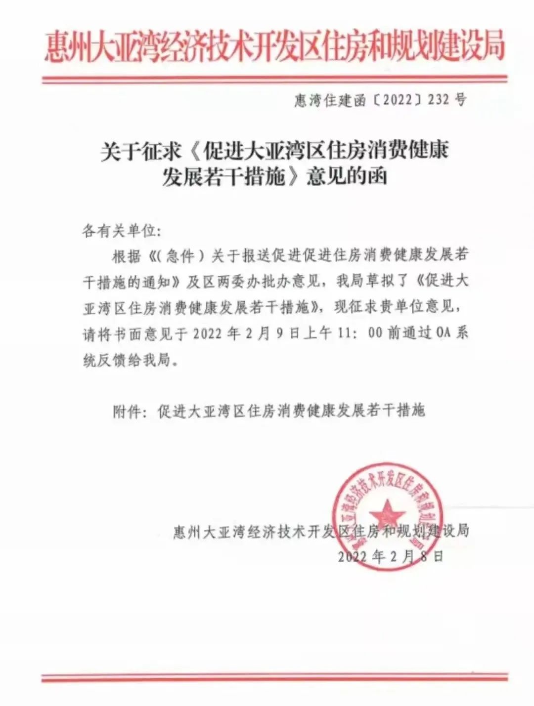 2月9日,一份蓋有“惠州大亞灣經(jīng)濟技術(shù)開發(fā)區(qū)住房和建設(shè)局”公章,名為關(guān)于征求《促進大亞灣區(qū)住房消費健康發(fā)展若干措施》意見函在網(wǎng)上流傳。