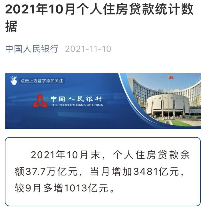 11月10日晚,央行官方微信號在發布了10月金融數據之后,單獨發文說10月個人住房貸款環比增加了1013億元。