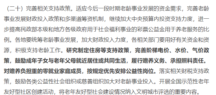 然后11月24日晚,中央《關于加強新時代老齡工作的意見》,專門提到鼓勵成年子女與老年父母就近居住或共同生活,履行贍養義務、承擔照料責任。
