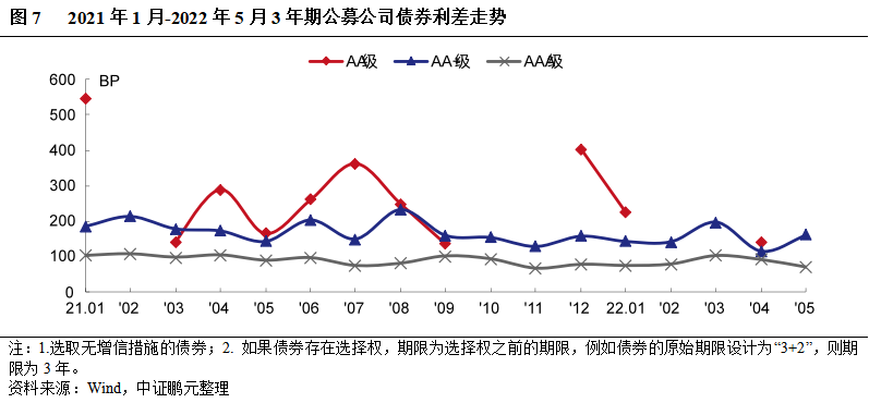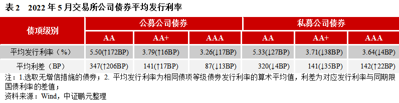 就發行利率而言,2022年5月份交易所公司債券的最高利率為7.80%,較上月最高利率下降10BP;最低發行利率為2.10%,較上月最低利率下降45BP。與4月份相比,公募公司債券方面,AAA級平均發行利率下行17BP、利差收窄13BP,AA+級平均發行利率上行16BP,利差擴大17BP,AA級平均發行利率上行172BP、利差擴大206BP;私募公司債券方面,AAA級平均發行利率下行4BP、利差擴大22BP,AA+級平均發行利率下行38BP,利差收窄35BP,AA級發行利率下行27BP、利差收窄4BP。