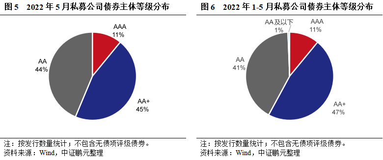 綜合2022年1-5月份的情況來看,主體級別仍以中高等級為主,AAA級、AA+級、AA級主體評級占比分別為39%、35%、26%。其中,公募公司債AAA級、AA+級、AA級主體評級占比分別為77%、19%、4%;私募公司債AAA級、AA+級、AA級及AA-及以下主體評級占比分別為11%、47%、41%、1%。