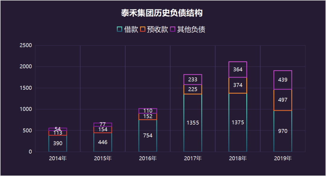 一直以來,泰禾都是依托于借款驅動,從2014年開始,借款占總負債比例一直維持在65%-75%之間。