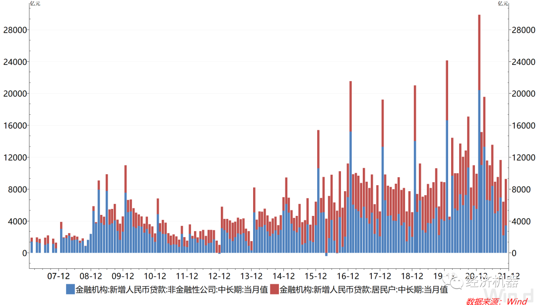 2)新增中長期貸款中,非金融企業(yè)貸款新增出現(xiàn)明顯下降,家庭和房地產(chǎn)貸款維持高位。11月中長期貸款中,非金融公司中長期貸款新增3417億,同比少增2470億元,較2019年同期還低約790億元。雖然11月企業(yè)生產(chǎn)有顯著改善,但信貸需求依然疲弱,可能表明企業(yè)對未來依然較為謹(jǐn)慎。