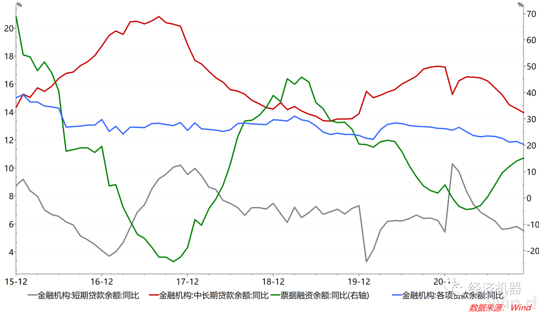 3)余額同比看,人民幣貸款增速與上月基本持平,有初步企穩(wěn)的跡象。11月,各項(xiàng)貸款余額同比增長11.7%,較上月微跌0.02個(gè)百分點(diǎn),2021年2月份以來增速持續(xù)回落的態(tài)勢得到緩解。分項(xiàng)來看,中長期貸款余額同比增速持續(xù)下滑,票據(jù)融資同比增速持續(xù)走高,表明信貸結(jié)構(gòu)變化趨勢延續(xù)。