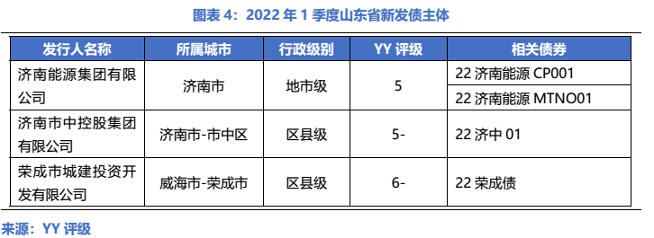在2022年一季度中,有3家城投主體為首次發債,分別為濟南能源集團有限公司、濟南市中控股集團有限公司和榮成市城建投資開發有限公司,發行金額合計為25億元。