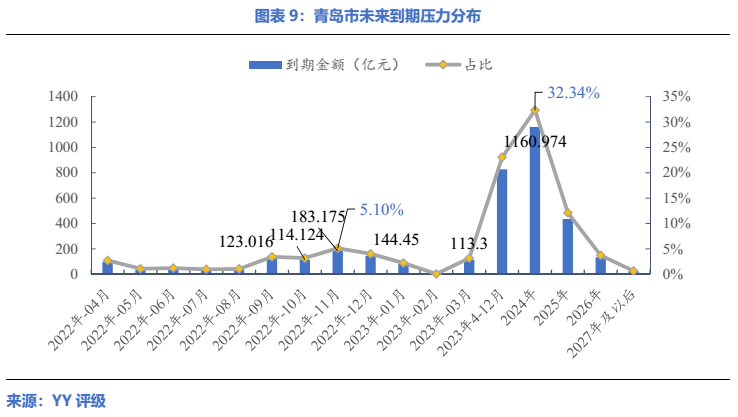 青島存續債3,590.17億元,其中有逾1,000億元將于一年內到期,占比28.15%。其中2022年9月、10月、11月、12月和2023年3月將有超過100億的存續債到期,未來2年償債額占存續額比例約51.19%,集中償付壓力也比較大。
