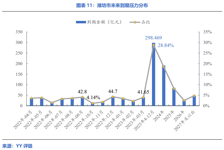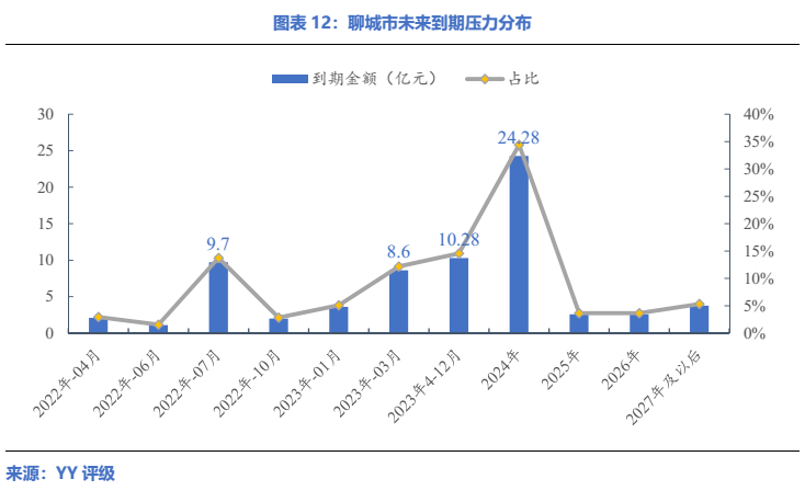 聊城一年內到期額占比較高,聊城存續債70.56億元,其中有27.08億元將于一年內到期,占比38.38%。相對而言,2022年7月和2023年3月到期量較高,分別為9.7億元和8.6億元,其余月份到期量均在5億元以下。