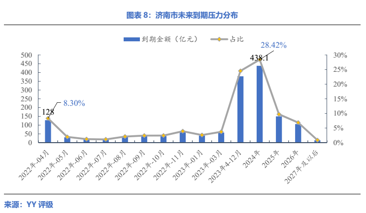 細看部分到期壓力較大的地級市,其中濟南市存續債1,541.58億,其中有約456.78億將于一年內到期,占比29.63%。其中2022年4月到期規模最大,為128億元,其余月份到期額均在60億元以內;濟南市2023年有近500億到期,未來2年的償債額占存續額比例逾50%,償債壓力較為集中。