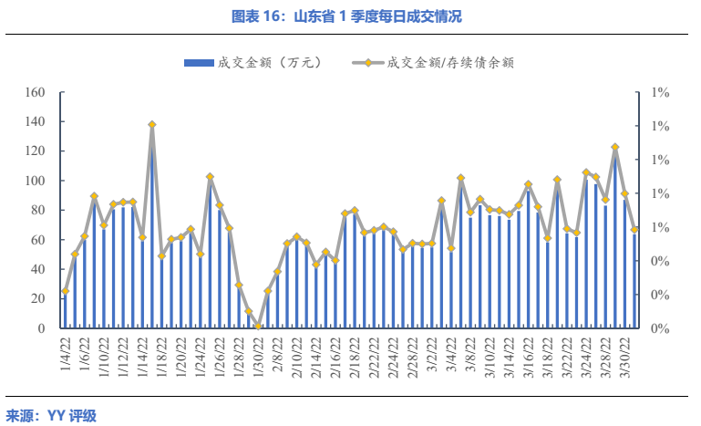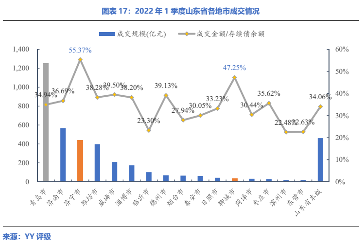 從各地市來看,青島市的成交金額依然遙遙領先,其次則是濟南、濟寧和濰坊。但從成交金額/存續債余額來看,濟寧和聊城成交更為活躍,成交金額占比均超過了45%,其余城市占比則在40%以下。