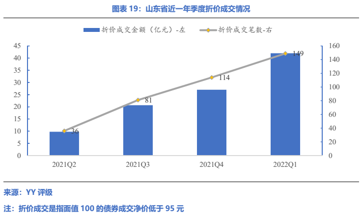 具體到主體,2022年1季度山東省發生折價成交的平臺主要為濟寧市市中區城建投資有限公司和魚臺縣鑫達經濟開發投資有限公司,二者在1季度的折價成交額分別占山東省的31.48%和30.53%。其中濟寧市市中區城建投資有限公司是山東省濟寧市任城區的主要城投平臺,資產流動性能力較弱,同時短期償債壓力增加,未來面臨較高的資本支出壓力,信用資質較弱。魚臺縣鑫達經濟開發投資有限公司是魚臺縣主要的基建平臺,層級較低且規模不大,資本支出壓力較大,對外擔保存在一定或有負債風險,信用資質弱。