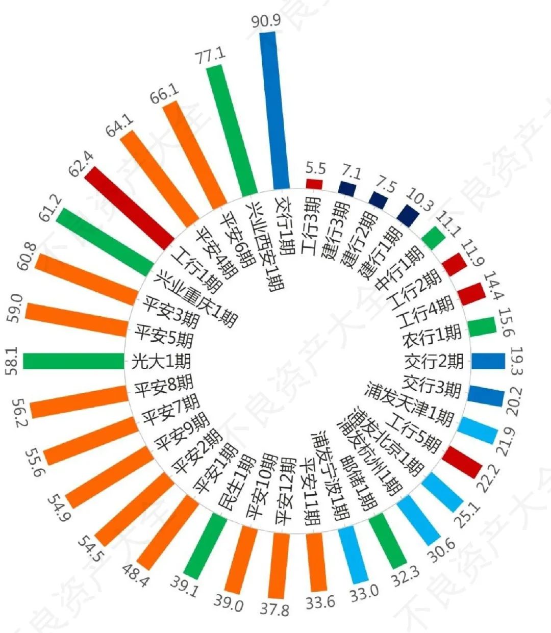 從已公告的34期銀行個(gè)貸不良資產(chǎn)來(lái)看,建行的三期平均逾期月數(shù)(按未償本息加權(quán)平均,下同)只有七個(gè)半月,即便在傳統(tǒng)清收領(lǐng)域,也不算長(zhǎng)賬齡資產(chǎn)。而平均逾期月數(shù)最長(zhǎng)的為平安銀行,接近五年。此外,工商銀行為41.6個(gè)月,交通銀行為31.9個(gè)月,浦發(fā)銀行為27.1個(gè)月,其余銀行則為1至5年不等。其中單期平均逾期月數(shù)最長(zhǎng)的為交行1期的90.9個(gè)月,賬齡超過(guò)七年半;最短的為工行3期不足半年。就銀行個(gè)貸不良來(lái)看,賬齡分布比較全面,客觀上基本照顧到了不同賬齡專(zhuān)長(zhǎng)的資產(chǎn)管理公司或處置機(jī)構(gòu)。