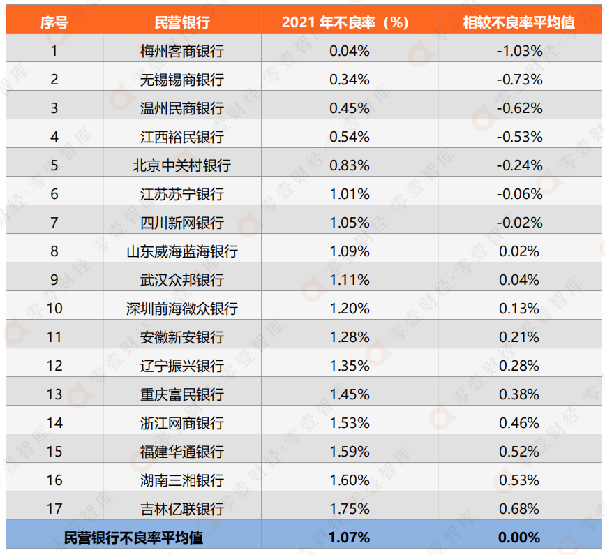 1、上表列出17家民營銀行的不良率數(shù)據(jù),此外有2家未披露:一是上海華瑞銀行,尚未發(fā)布2021年報;二是天津金城銀行,未披露2021年度不良率數(shù)據(jù);