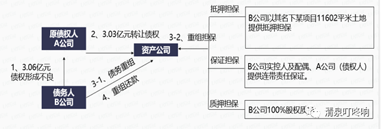 以某項目為例。在該項目交易結構中,該資產公司以折價3.03億元收購了A公司對B公司3.06億元的不良非金債權,然后再對該項目債權進行了期限、重組寬限補償金、擔保措施等要素重組。