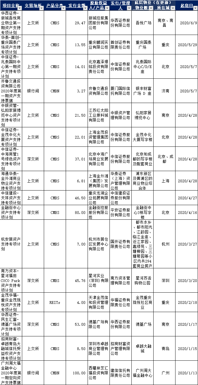 2020年1月1日至2020年6月30日,國內已發行CMBS(含CMBN、下同)/類REITs產品35單,總規模815.44億元(不含儲架規模),其中類REITs產品6只、CMBS產品29只(含CMBN3只)。其中以購物中心/商場為底層資產的CMBS/類REITs產品25只。標的物業分布以上海/北京居多及其他強二線城市為主。