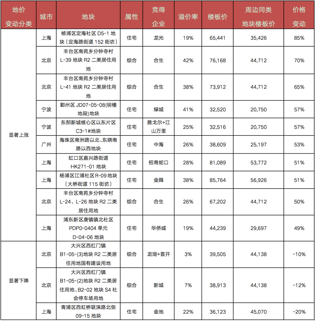 高價(jià)地價(jià)格變動(dòng)情況來看,將二季度以來成交的樓板價(jià)TOP50地塊的樓板價(jià)與其周邊近期同類地塊樓板價(jià)對(duì)比,超九成高價(jià)地樓板價(jià)較之前均有上漲,八成地塊樓板價(jià)漲幅超過10%,漲幅較高的多位于京、滬供地稀缺的核心板塊。