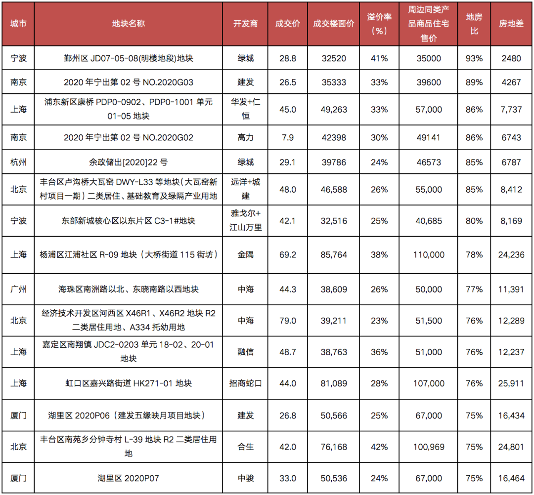 典型如綠城摘得的寧波鄞州區(qū)JD07-05-08(明樓地段)地王項(xiàng)目,該地塊樓板價(jià)達(dá)到32520元/平方米,而周邊在售的建邦·璟譽(yù)府均價(jià)為35000元/平方米,地房比高達(dá)93%,房地差僅有2480元/平方米。