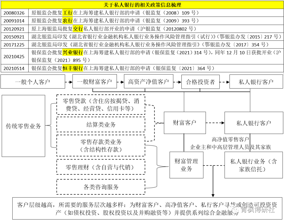 2、私人銀行業(yè)務是財富管理業(yè)務,是針對特定客群(含私人銀行客戶本人、家族及企業(yè))的財富管理業(yè)務,是更高端的財富管理業(yè)務。