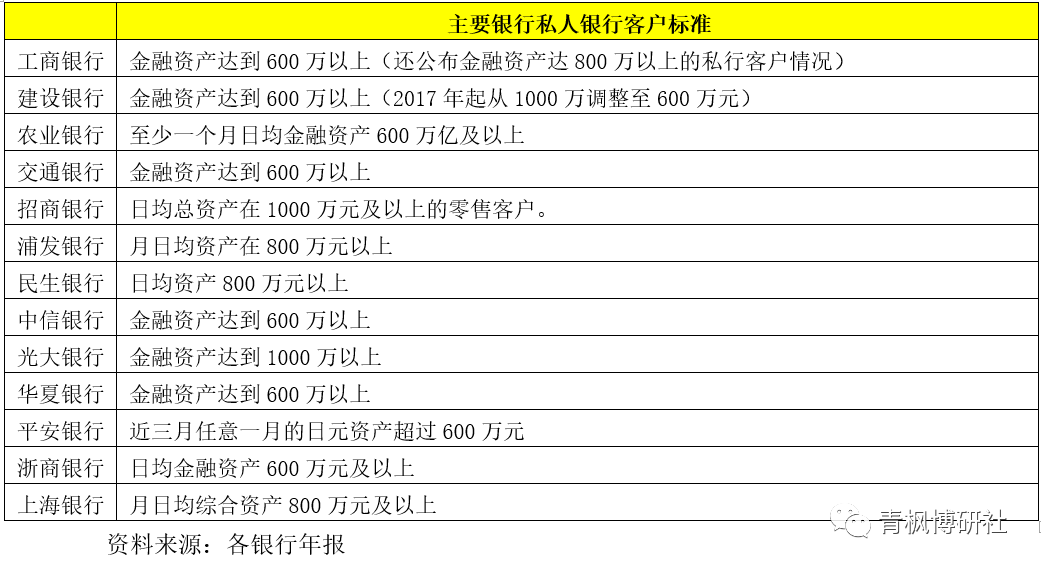 (1)工行、農行、交行、平安銀行、中信銀行以及浙商銀行的私人銀行客戶標準是日均金融資產在600萬元(含)以上。