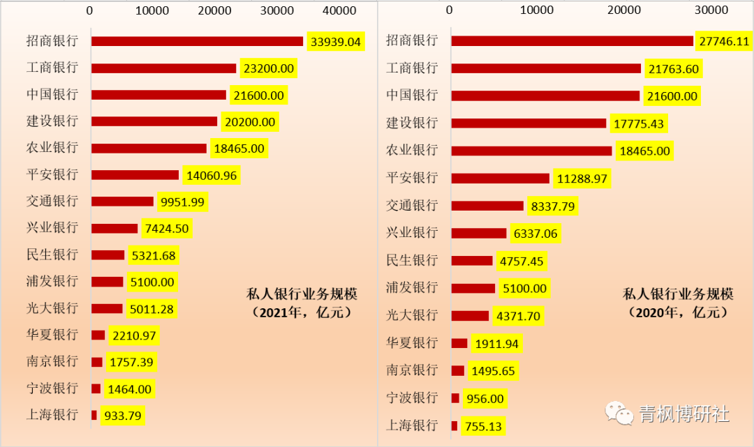 (1)寧波銀行與上海銀行披露了其2021年底的私人銀行管理資產規(guī)模分別為1464億元和934億元,是城商行中私行業(yè)務規(guī)模最大的兩家銀行。