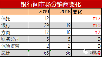 從數(shù)量上來看,2019年具有參團分銷資格的市場成員,從2018年初的36家快速上升到65家,其中信托公司和銀行成為新增主力,分別達到12家和10家。背后其實體現(xiàn)的就是微觀經(jīng)濟學的樸素原理——行業(yè)出現(xiàn)超額利潤會吸引更多的競爭者進入,最終會降低行業(yè)的整體利潤水平。