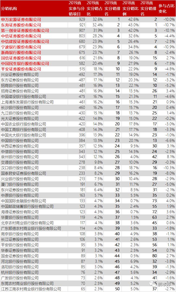 同樣按照去除主承項目之后參與的分銷項目個數(shù)作為真實參與分銷項目情況,與2018年全年情況對比如下表所示: