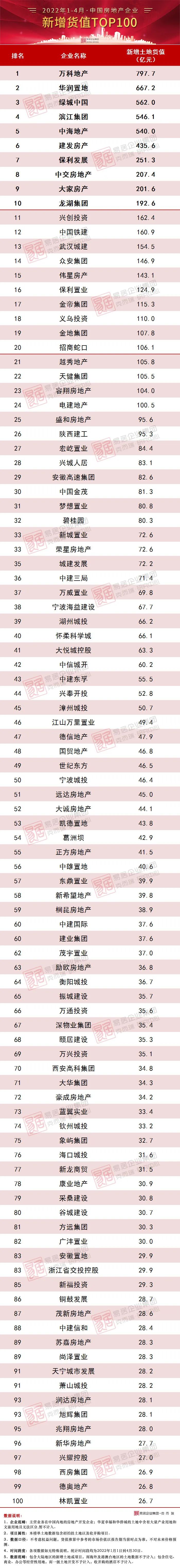 原標(biāo)題: 2022年1-4月中國房地產(chǎn)企業(yè)新增貨值TOP100排行榜