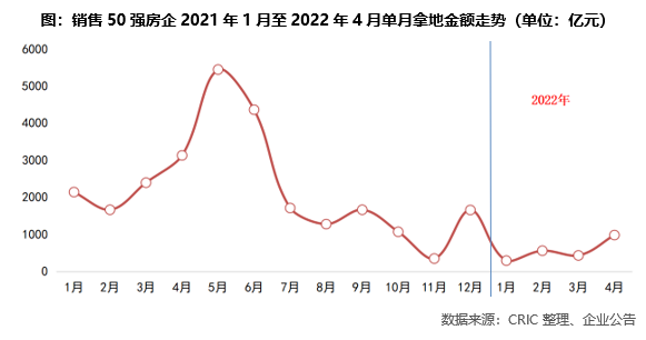 在多個(gè)熱點(diǎn)城市首輪集中供地開啟之下,房企單月拿地金額略有回升。銷售TOP50房企單月拿地金額接近1000億元,環(huán)比上漲127%,但同比依舊下跌69%。整體來看,前四月,有超過三成TOP50房企未拿地,市場下行、資金緊張帶來的投資壓力并沒有隨著部分城市土拍火熱而幅好轉(zhuǎn)。