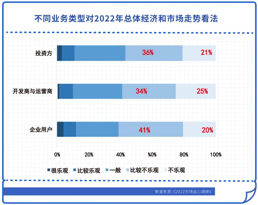 “2022市場信心調研”結果顯示,疫情加重企業生存壓力,61%的企業用戶認為2022年總體經濟和市場走勢不樂觀或者比較不樂觀,占比最高,其次為開發商與運營商,有34%認為比較不樂觀,25%認為不樂觀,合計占59%。
