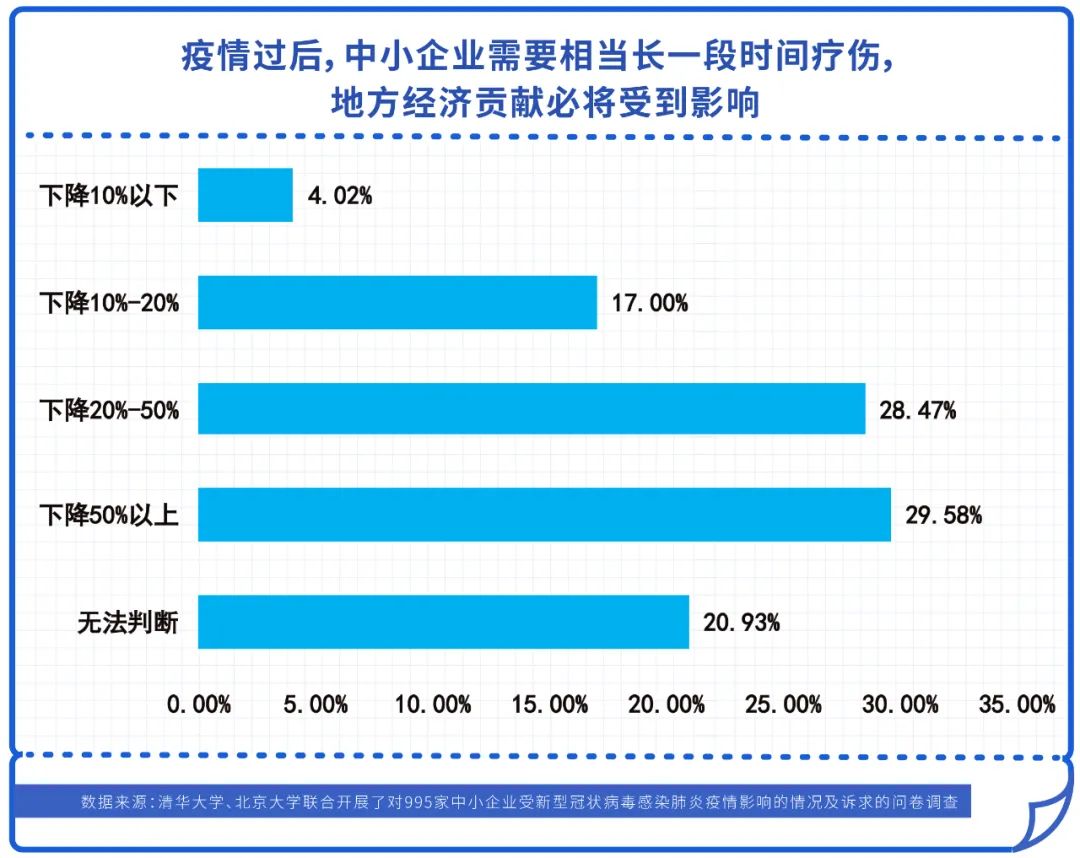 近三成受訪企業表示疫情對營業收入的影響將在50%以上。近半數企業表示今年營收至少下降20%。疫情過后,中小企業需要相當長一段時間療傷,地方經濟貢獻必將受到影響。