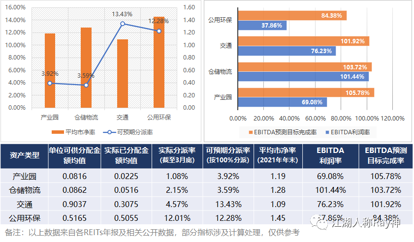 我們?cè)購(gòu)腞EITs的底層資產(chǎn)類型來(lái)分析一下。目前已發(fā)行的最多是基于產(chǎn)業(yè)園和高速公路,各有4個(gè);剩下的基于倉(cāng)儲(chǔ)物流和公用環(huán)保類資產(chǎn)的各有2個(gè)。我們稍稍統(tǒng)計(jì)一下就會(huì)發(fā)現(xiàn)公用環(huán)保類的資產(chǎn)實(shí)際分派和市凈率都是最高的。但是,值得注意的是這兩個(gè)REITs年報(bào)披露的EBITDA利潤(rùn)率或是其預(yù)測(cè)目標(biāo)的完成比例均不及投資其他類型資產(chǎn)的REITs。這也就是說(shuō)當(dāng)下分派率高并不一定意味著底層資產(chǎn)的表現(xiàn)優(yōu)越,而沒有合理收益作支撐的基金溢價(jià)后續(xù)必將會(huì)給投資者帶來(lái)風(fēng)險(xiǎn)。