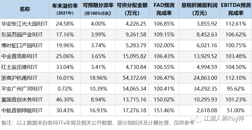 那么,面對(duì)實(shí)體經(jīng)濟(jì)的壓力山大,這些投資于相關(guān)基礎(chǔ)設(shè)施的REITs的業(yè)績(jī)真的都有這么好嗎?首先,值得肯定的一點(diǎn)是首批發(fā)行的9個(gè)REITs在2021年的可供分配金額(FAD)基本上都超過(guò)了招募時(shí)的預(yù)測(cè)目標(biāo),息稅折攤前利潤(rùn)(EBITDA)完成率也大多能夠達(dá)標(biāo)。