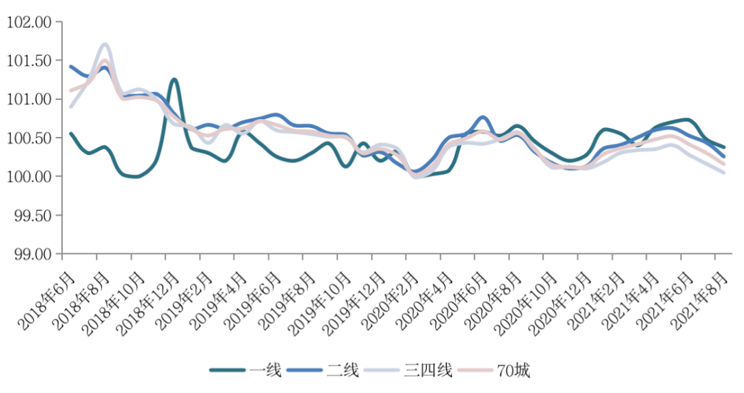 圖:2018年6月至2021年8月70個大中城市房價指數環比變化