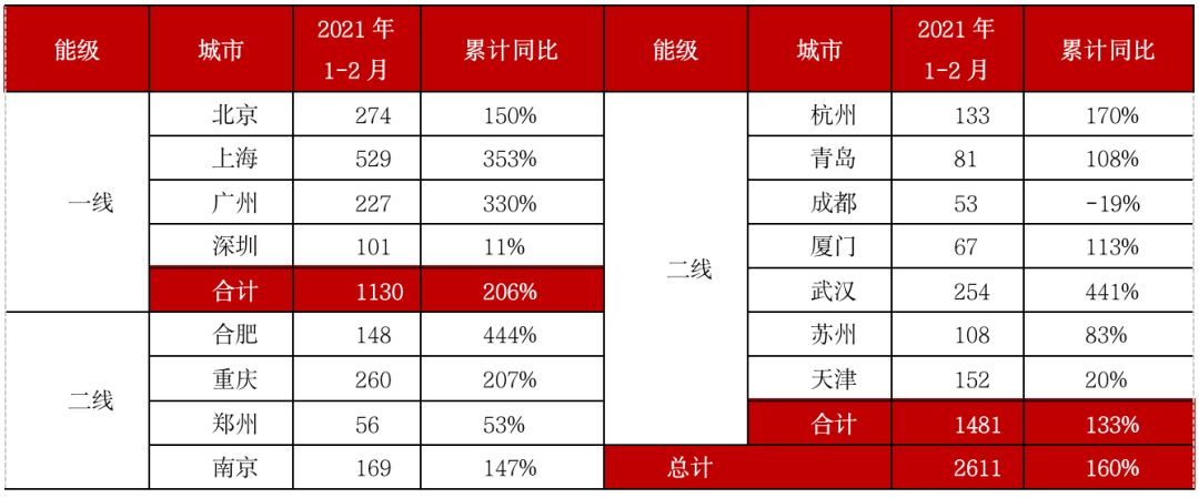 一線城市成交面積上揚顯著,同比漲幅高達206%。上海和廣州最為亮眼,1-2月成交量分別為529萬平方米和227萬平方米,同比上漲均超過300%;北京其次,累計同比增速也高達150%;僅深圳市場增幅11%較為穩定,其原因在于前期增長較快已升至高位,市場調控日益趨嚴。