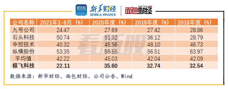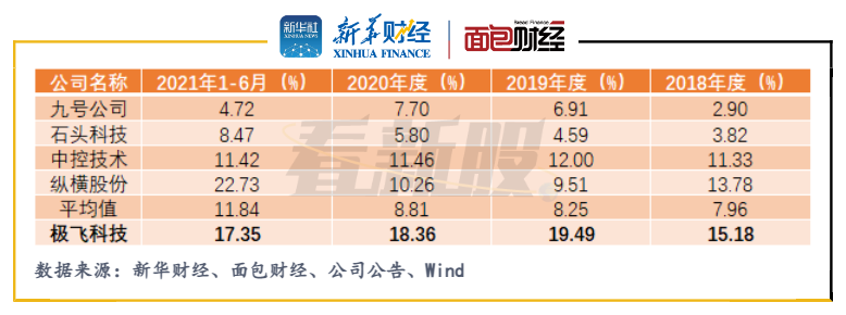 值得關(guān)注的是,極飛科技的毛利率也在持續(xù)走低。2021年上半年,公司毛利率滑坡至22.11%,低于可比公司均值約20個(gè)百分點(diǎn)。