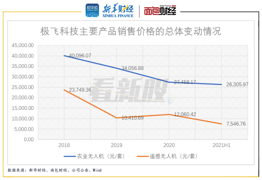 在激烈競(jìng)爭(zhēng)之勢(shì)下,極飛科技核心產(chǎn)品也被迫持續(xù)降價(jià)。2018年至2021年6月,公司農(nóng)業(yè)無(wú)人機(jī)的售價(jià)由4.01萬(wàn)元/套下降至2.63萬(wàn)元/套,降幅達(dá)34.39%;遙感無(wú)人機(jī)從2.37元/套降至7547元/套,降幅達(dá)68.22%。