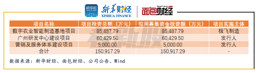 極飛科技此次擬公開發(fā)行普通股不超過(guò)6001萬(wàn)股,約占公司發(fā)行后總股本的15%,募資金額約15.09億元,主要用于數(shù)字農(nóng)業(yè)智能制造基地項(xiàng)目、廣州研發(fā)中心建設(shè)項(xiàng)目、營(yíng)銷及服務(wù)體系建設(shè)項(xiàng)目。