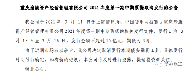 根據wind資訊3月17日的公告信息,多家AAA發行人公布了債券取消發行公告:重慶渝康資產經營管理有限公司 “21渝康資產MTN001”取消發行(15億元)、普洛斯中國控股有限公司“21普洛斯MTN001A”和“21普洛斯MTN001B”(25億元)取消發行、取消發行(10億元)、江西省投資集團有限公司“”取消發行(10億元),累計取消金額60億元。