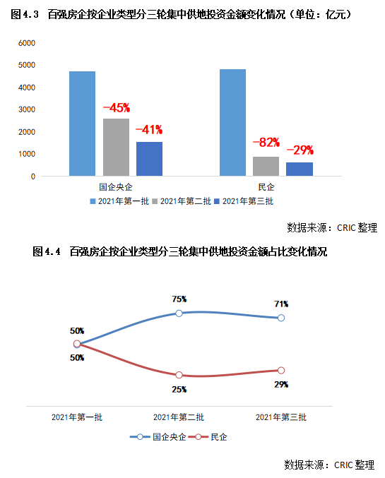 在首輪投資金額相近的情況下,第二輪集中供地中國(guó)企央企投資力度下滑45%左右,第三輪又較第二輪下降41%左右;而民企的第二輪投資力度大降82%,第三輪又在此基礎(chǔ)上下滑29%。無(wú)論從絕對(duì)值還是降幅的對(duì)比來(lái)看,民企投資受到的影響都更為嚴(yán)重。