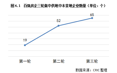 在首輪集中供地時(shí)僅有19家房企未拿地,而不拿地的房企數(shù)量在第二、三輪集中供地時(shí),飆升至52家和65家,還在拿地的房企反而成為少數(shù)。