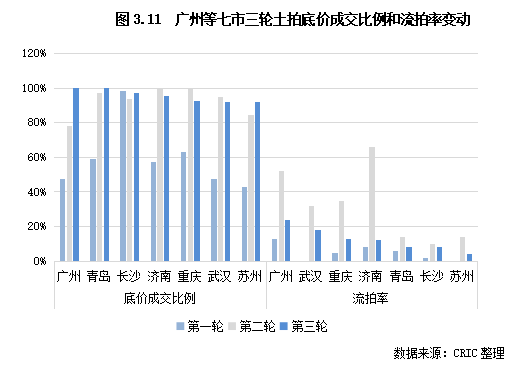 具體城市來(lái)看,僅有寧波、杭州、合肥、深圳、成都5城市溢價(jià)率達(dá)5%及以上,其余城市溢價(jià)率均在5%以下,長(zhǎng)春、天津、武漢、廣州等城市均全部為底價(jià)成交。相比之下,重點(diǎn)城市首輪溢價(jià)率大都處于高位,像重慶、深圳、廈門(mén)、杭州、寧波等城市溢價(jià)率均超20%;二輪雖然熱度明顯下降,但仍有廈門(mén)、福州、深圳等少數(shù)城市溢價(jià)率超過(guò)10%。至于流拍率,雖然第三輪較第二輪明顯好轉(zhuǎn),但依然處于高位,整體流拍率達(dá)21%。