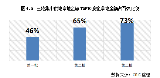 然而在房企大幅收斂投資的情況下,投資TOP10房企的金額集中度還不降反升:首輪集中供地中,投資TOP10金額占百?gòu)?qiáng)的46%,這一比例在第二、三輪中攀升至65%和73%。