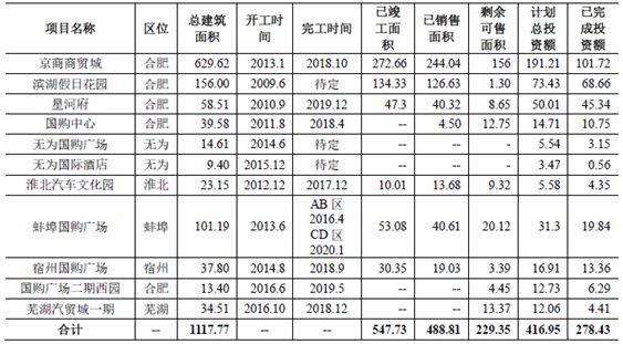 除去司爾特的4.45億存貨外,公司存貨約有121億,主要是開發(fā)成本和開發(fā)產(chǎn)品,但其實(shí)很難從公司的年報(bào)和評(píng)級(jí)報(bào)告中把存貨細(xì)項(xiàng)直接核對(duì)出來。從在建地產(chǎn)項(xiàng)目來看,投入金額總和為278億,遠(yuǎn)大于121億的存貨金額,說明公司公布的在建項(xiàng)目里面有部分其實(shí)已經(jīng)結(jié)轉(zhuǎn)了;金額最大的幾個(gè)項(xiàng)目是合肥京商商貿(mào)城、濱湖假日花園、星河府和合肥國(guó)購中心;然而在17年9月底時(shí),公司經(jīng)營(yíng)性物業(yè)面積最大的就是合肥京商商貿(mào)城和合肥國(guó)購中心,而且這兩項(xiàng)目都還處于招商中,說明公司的業(yè)績(jī)嚴(yán)重依賴于兩三個(gè)在開發(fā)以及已建成但還未運(yùn)營(yíng)的項(xiàng)目-合肥京商商貿(mào)城、合肥國(guó)購中心和星河府。這三個(gè)項(xiàng)目中,除了星河府有部分住宅外,其它基本都是商辦和公寓酒店這類去化非常慢的項(xiàng)目,所以有地產(chǎn)開發(fā)界人士曾告訴筆者國(guó)購是死于商業(yè)地產(chǎn)也不無道理。