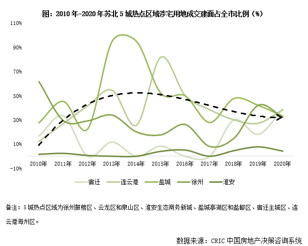 與全市土地市場充盈相反的是,熱點區域宅地供應緊缺,近年5城土地供求有明顯向城市外延的郊縣傾斜的趨勢。以已出現“萬元地”的徐州鼓樓區、云龍區和泉山區、淮安生態商務新城、鹽城亭湖區和鹽都區、宿遷主城區等區域和連云港市府所處的海州區為蘇北5城熱點區域。從涉宅用地成交建面占比來看,5城熱點區域占比2015年后呈降低趨勢,至2020年占比均低于4成。其中淮安生態商務新城涉宅用地成交僅占全市總建面不足5%,徐州2020年云龍區僅出讓4宗涉宅用地。故,熱點區域宅地供不應求是蘇北5成普遍存在的共性特征。