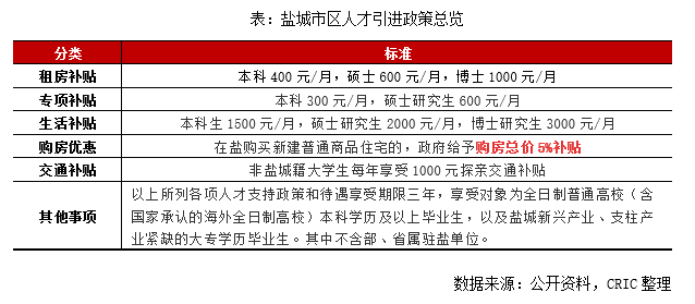 與此同時,鹽城為吸引人才也出臺了住房補貼、購房補貼、專項補貼、生活補貼、交通補貼等多種優惠措施。譬如在鹽企業就業或自主創業的全日制本科及以上大學生,可以申請政府公租房或者享受租房補貼,本科400元/月、碩士600元/月、博士1000元/月。到鹽城縣市企業就業或者自主創業的大學生戶籍可在大市區落戶。在鹽購買新建普通商品住宅的,政府給予購房總價5%補貼。