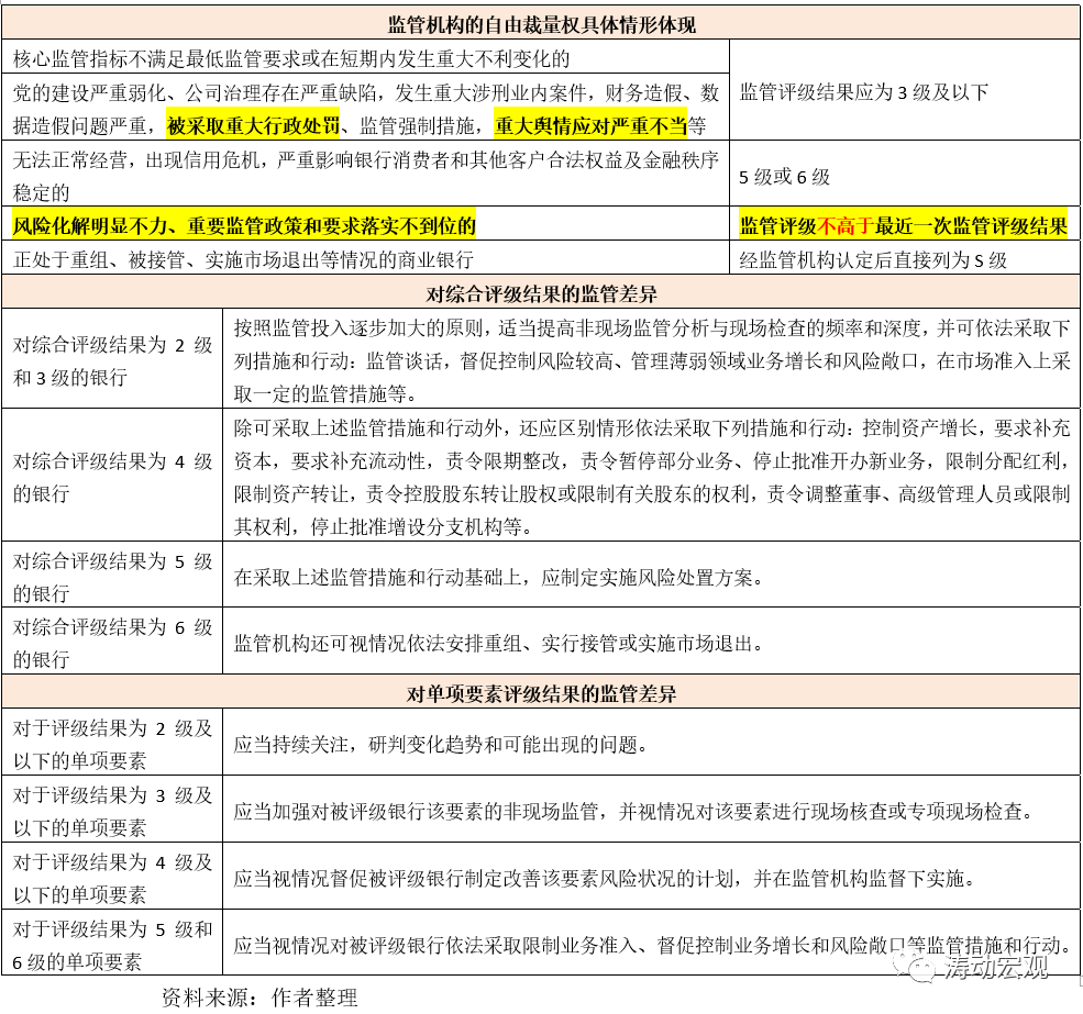 監管機構可根據評級結果的差異,采取不同的監管舉措,一般根據評級檔次的高低,按照監管投入逐步加大的原則,適當提高監管力度。目前來看,只有評級結果為1級的銀行,才可以豁免相應監管。
