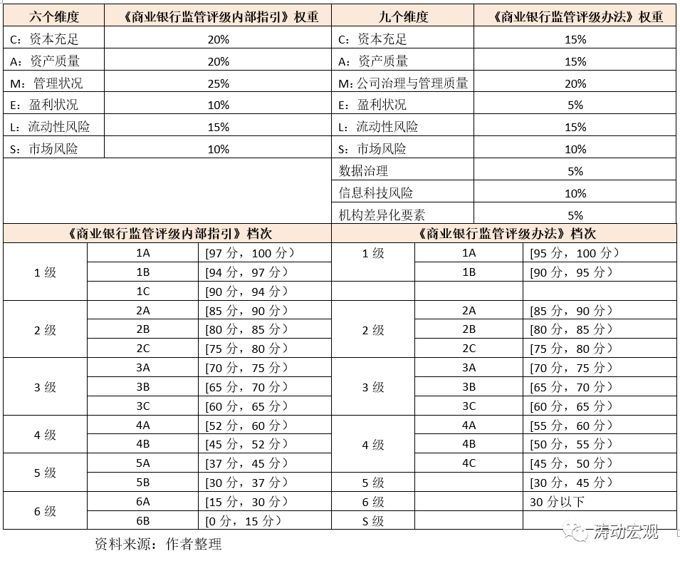 3、將各維度的分值權重進行了相應的調整,如資本充足、資產質量、公司治理與管理質量以及盈利狀況等四個維度的權重分別下調了5個百分點,通過新增的三個維度來彌補,而流動性風險與市場風險維度的權重則保持不變。