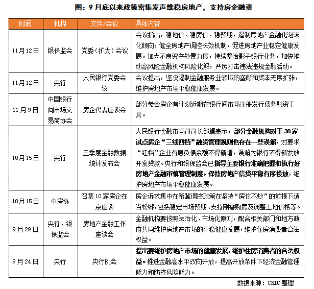 9月末央行首次提及“兩個維護”,指導銀行準確把握和執(zhí)行好房地產(chǎn)金融審慎管理制度,保持房地產(chǎn)信貸平穩(wěn)有序投放,維護房地產(chǎn)市場平穩(wěn)健康發(fā)展。10月15日,中房協(xié)召集了10家房企在京座談,住建部相關部門人員參與主持,據(jù)透露,房企的主要訴求集中在希冀調控政策在堅持“房住不炒”的前提下適當松綁,包括穩(wěn)定市場預期、支持剛需購房及調整土地價格等。此后,央行和銀保監(jiān)會又多次提及促進房地產(chǎn)行業(yè)穩(wěn)定健康發(fā)展。在此情況下,政策端風向有所緩和,從宏觀上對房地產(chǎn)信心重塑有所推進,維穩(wěn)房地產(chǎn)。